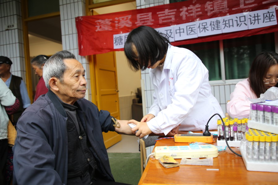 上午10点,三合碑社区的孝老文化广场上,16张圆桌整齐排开。老人们早早来到现场,满脸笑意,大家一边品茶聊天,一边欣赏精彩演出;安居区人民医院的医务人员正贴心为老人测量血压、检测血糖。