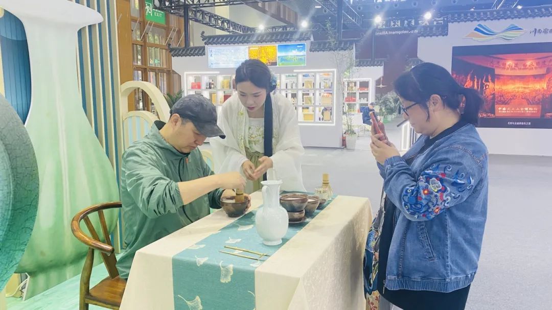 遂宁展馆以“一壶舍得酒 半城观音湖”为主题,以青色为主色调,巧妙融入宋瓷、荷花、观音湖等元素,构建出错落有致、层次分明的宋式建筑美学空间,充分展现了遂宁这座实力之城、活力之城、魅力之城。同时,借助多媒体展陈、互动打卡、宋式点茶以及特色文创产品,让与会嘉宾和游客可观、可听、可品、可购。