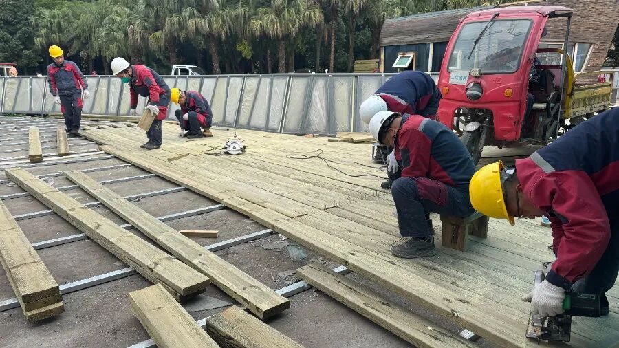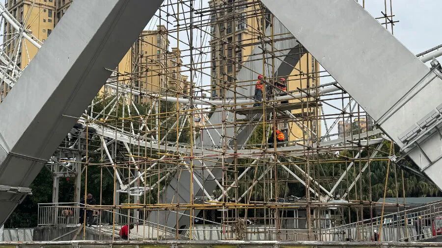 记者在施工现场看到,各项作业正有序推进。摩天轮原有箱体已全部拆除,工作人员系着安全绳在高空作业,对核心承重部件的钢丝绳进行细致检查与加固。此次升级维护聚焦安全与体验双提升,除了对老旧轿厢整体翻新、更换磨损的防腐木地板,还将对配套营业房进行全方位改造,全面优化服务环境,让设施焕发新活力。