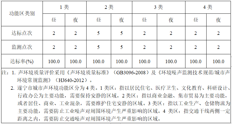 本季度,遂宁市各类功能区昼间噪声、夜间噪声监测点次达标率统计见表4。