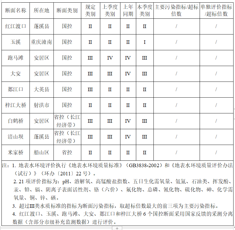 本季度,遂宁市9个国、省控地表水监测断面水环境质量状况、主要污染指标、环比和同比情况见表2。