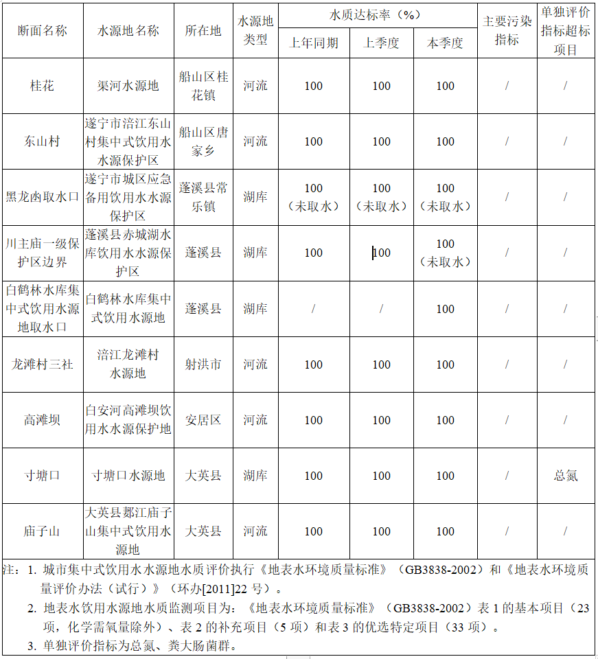 本季度,遂宁市(含县、市、区)集中式饮用水水源地监测断面的水质情况见表3。