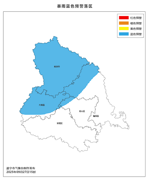 遂宁市气象台2025年9月27日15时50分发布暴雨蓝色预警: