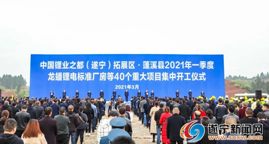3月22日,中国锂业之都(遂宁)拓展区·蓬溪县2021年一季度龙蟠锂电标准厂房等40个重大项目集中开工仪式在蓬溪经开区金桥片区举行。市委书记邵革军出席并宣布开工。市委副书记、市长邓正权,市人大常委会主任周霖临,市政协主席杨军,市委副书记景临出席开工仪式。