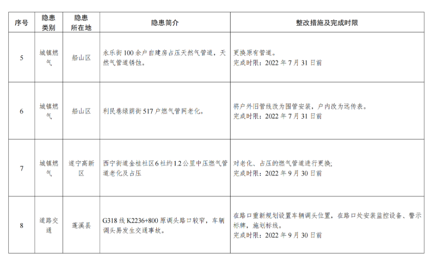 《通知》要求,各县(市、区)、市直园区要专题研究隐患整改,明确整改责任主体,细化整改方案,确保挂牌隐患按时限要求高质量整改到位。要强化隐患整改中的安全管理,确保不因隐患失控引发生产安全事故,确保隐患整改过程不因施工处置不当引发事故。