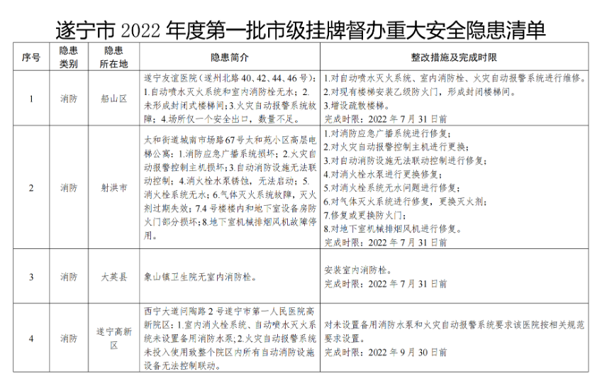 为持续深化安全生产隐患排查治理,切实消除安全隐患,有效防范和坚决遏制较大及以上生产安全事故,近日,遂宁市安委会发布《关于2022年度第一批市级挂牌督办重大安全隐患的通知》,对14个重大安全隐患进行挂牌督办。