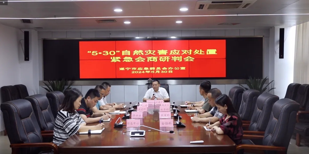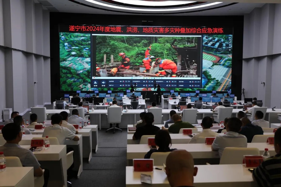 “报告郭局长,4号大坝发生漫坝,水位还在持续上涨。”“报告红彬县长,5月30日,荷叶乡有群众陆续出现出现呕吐、腹泻、头晕等食物中毒症状……”演练模拟邻市某县发生7.0级地震,遂宁市部分县(市、区)出现房屋受损、人员被砸受伤事件。同时,因地震形成的堰塞湖突然溃坝,叠加持续强降雨影响,多地发生洪涝、地质灾害等多灾种叠加灾害。灾情发生后,市级抗震救灾、防汛抗旱、地质灾害指挥部启动专项应急预案,同步启动多灾种叠加应急预案,派出前方指挥部和工作组统筹各地开展地震紧急转移避险,地质灾害抢险救援、应对涪江洪水,水库漫坝、溃坝、次生、衍生灾害链等应急救援工作。