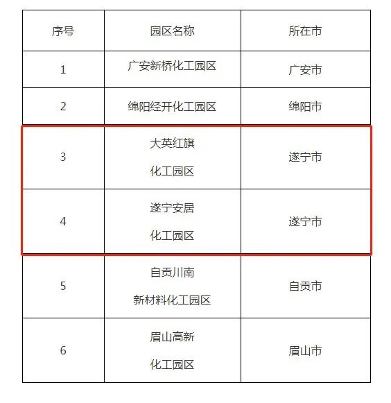 4月1日,四川省经济和信息化厅、四川省发展和改革委员会、四川省自然资源厅等6部门发布通知,公布我省首批化工园区名单,共有6个化工园区上榜,涉及广安、绵阳、遂宁、自贡、眉山等5市。
