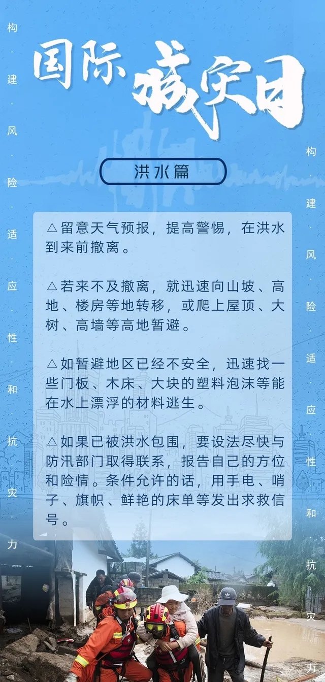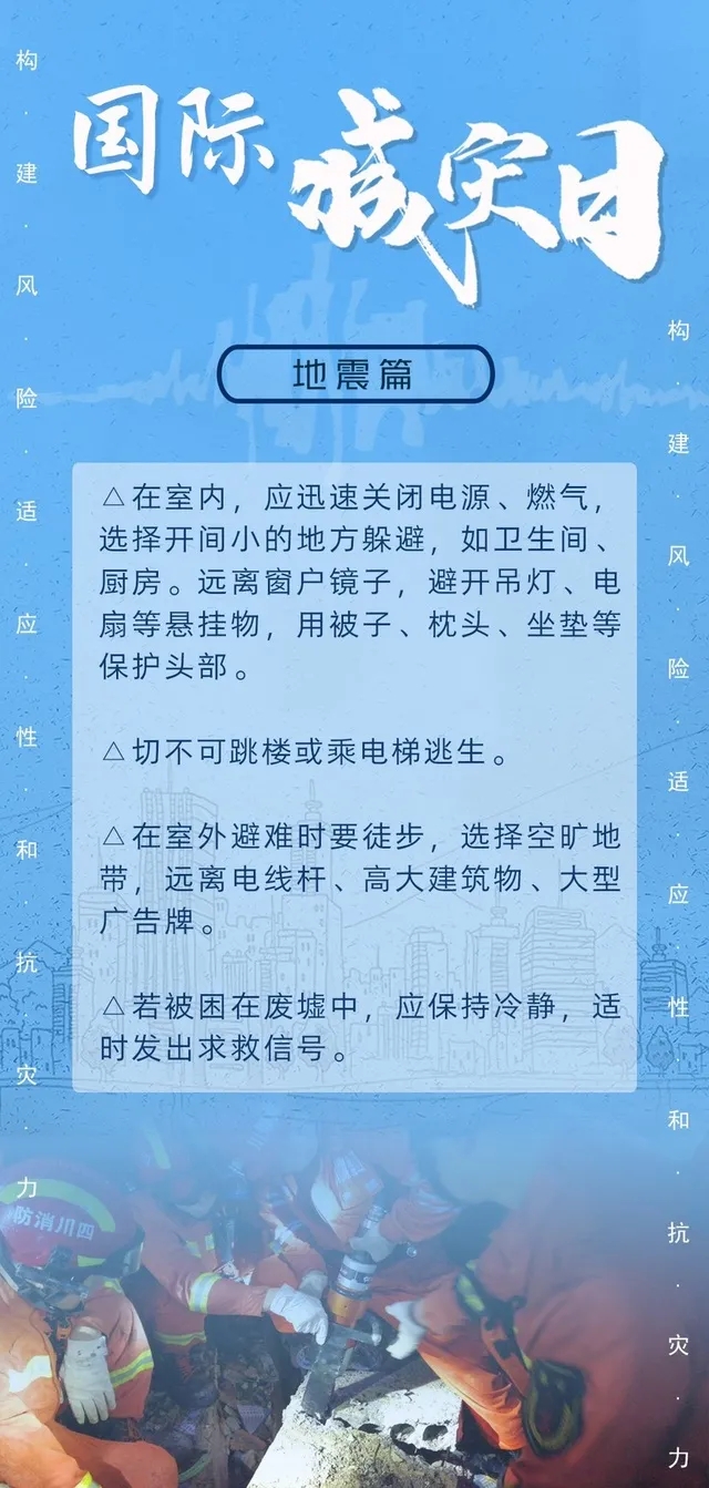 据悉,2021年10月13日是第32个国际减灾日,今年的主题是“构建灾害风险适应性和抗灾力”。在遇到灾害时,如何才能不慌乱,高效地自保逃生,下面这些自救的基本常识要记牢了。