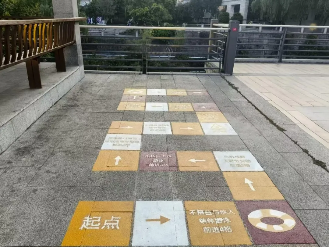 老年活动中心广场绿树成荫,广场不远处就是缓缓流淌的小郪河,不少中老年人带着小孩在这里纳凉,“大爷大妈,最近天气热,一定要把小朋友看好,莫让他们去河边上玩”盐井街道办的全区网格员李姐正为他们发放宣传手册,口中不停的说着宣传防溺水安全知识,还耐心解答群众提出的问题,让防溺水宣传深入人心。同时,大英县还在儿童玩耍的空地上制作了“防溺水”格子跳,格子里写着各种防溺水知识。孩子们可以一边在格子上蹦蹦跳跳,一边学习安全知识,这种融学于趣的方式让知识更容易被记住,孩子们玩得开心,学得也扎实。