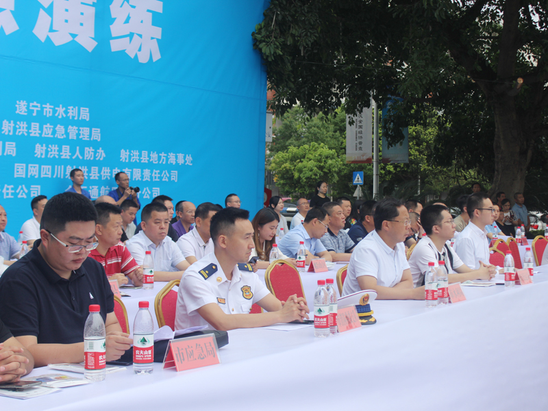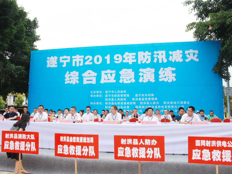 为进一步增强全社会防灾救灾应急意识,检验遂宁市防灾救灾整体联动机制,提高各级、各部门快速反应、协调联动、高效处置的能力,6月28日,遂宁市举行2019年防汛减灾综合应急演练,遂宁市人民政府副市长雷云,市人民政府副秘书长周宗利、市应急管理局局长王金兵、市消防支队参谋长李连胜等主要领导出席了此次演练,射洪县31个相关部门参加了此次演练。