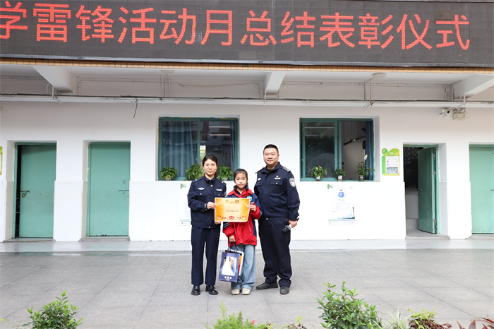 4月7日,在遂宁市船山区裕丰街小学的学雷锋活动月总结表彰仪式上,市公安局船山区分局仁里派出所民警为该校五年级学生陈玥涵带来一份特殊的礼物——失主一家给陈玥涵写的感谢信,及失主和民警送的文具、警察小熊玩偶,并现场向陈玥涵颁发“拾金不昧好少年”奖状。