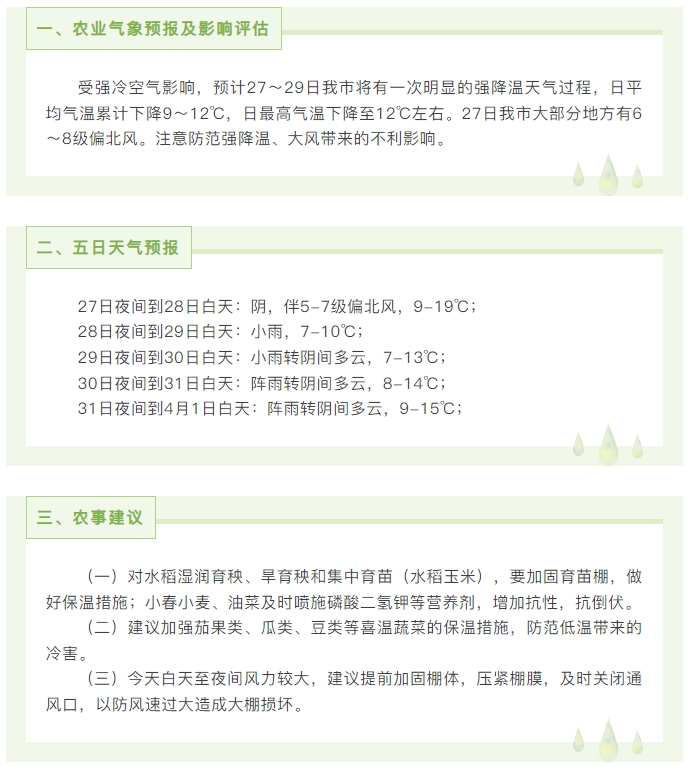 3月27日,遂宁市农业农村局、遂宁市气象局联合发布一份紧急预警,提醒大家注意即将到来的强降温和大风天气,并提供了一些实用的农事建议。
